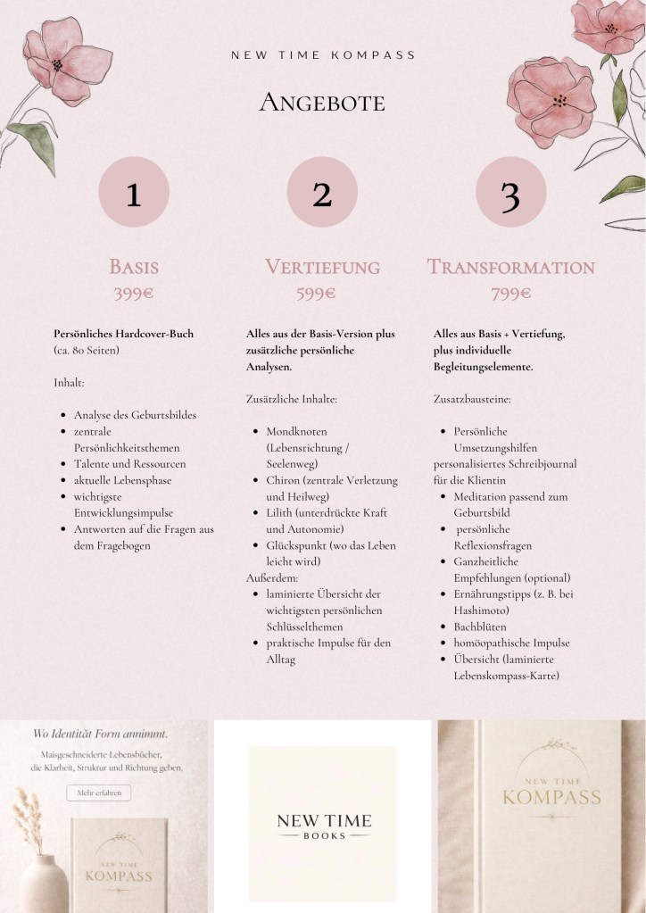 „Ein individuell erstelltes Buch, das deine aktuellen Themen, Ziele und Werte klar strukturiert. Du erhältst Orientierung, praktische Impulse und einen roten Faden für die Umsetzung im Alltag.“