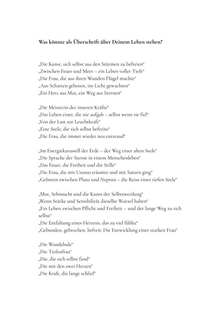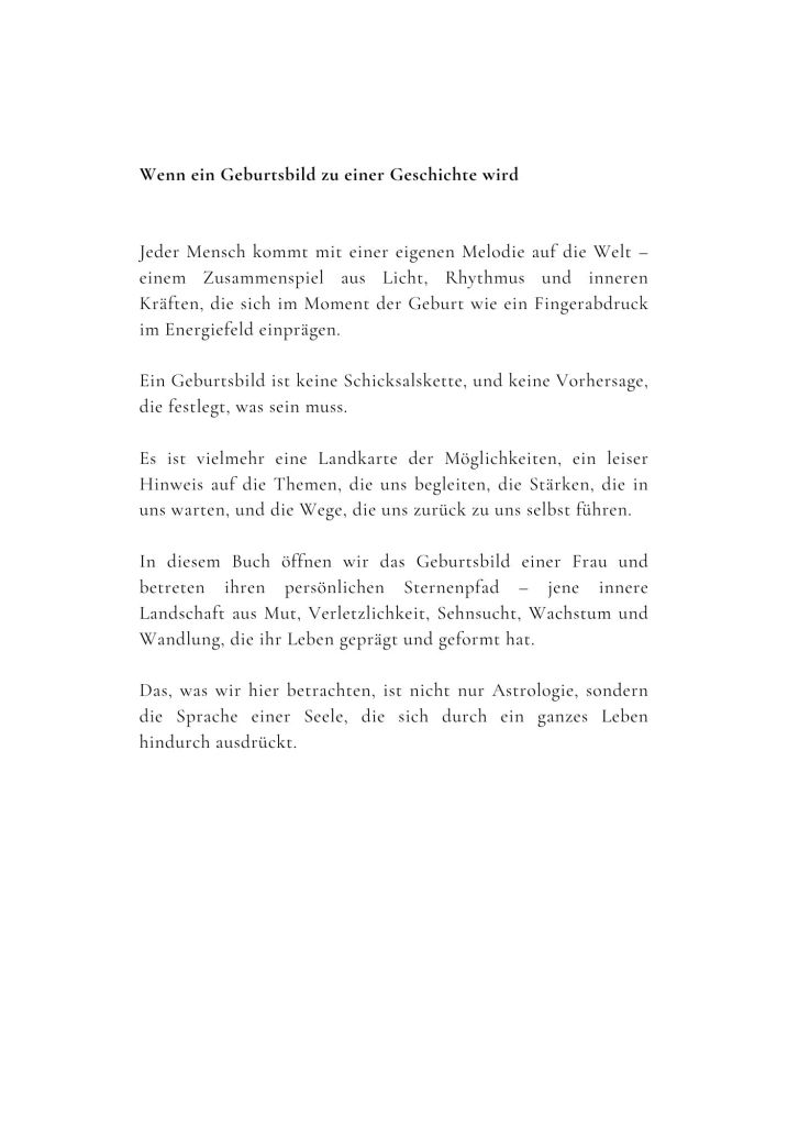 Aus der Verbindung von Astrologie, Lebenserfahrung und intuitiver Analyse entsteht ein individuelles Ratgeberbuch, das speziell für dich geschrieben wird.
